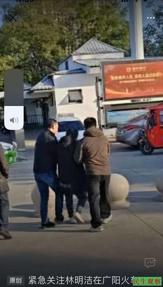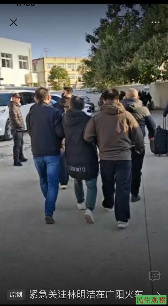 据目击者杨忠庆描述,2025年10月19日上午,他在沈阳站偶遇一同坐K28到北京的林明杰,其在广阳站想下车吃饭时,被不明身份人员架到一辆白色的汽车上拉走。