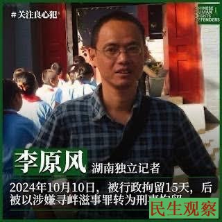李原风,男,1970年4月12日出生,本名李维忠,网名原野之风、原风,湖南省益阳市沅江市人,独立记者,人权捍卫者,中国在押政治犯。