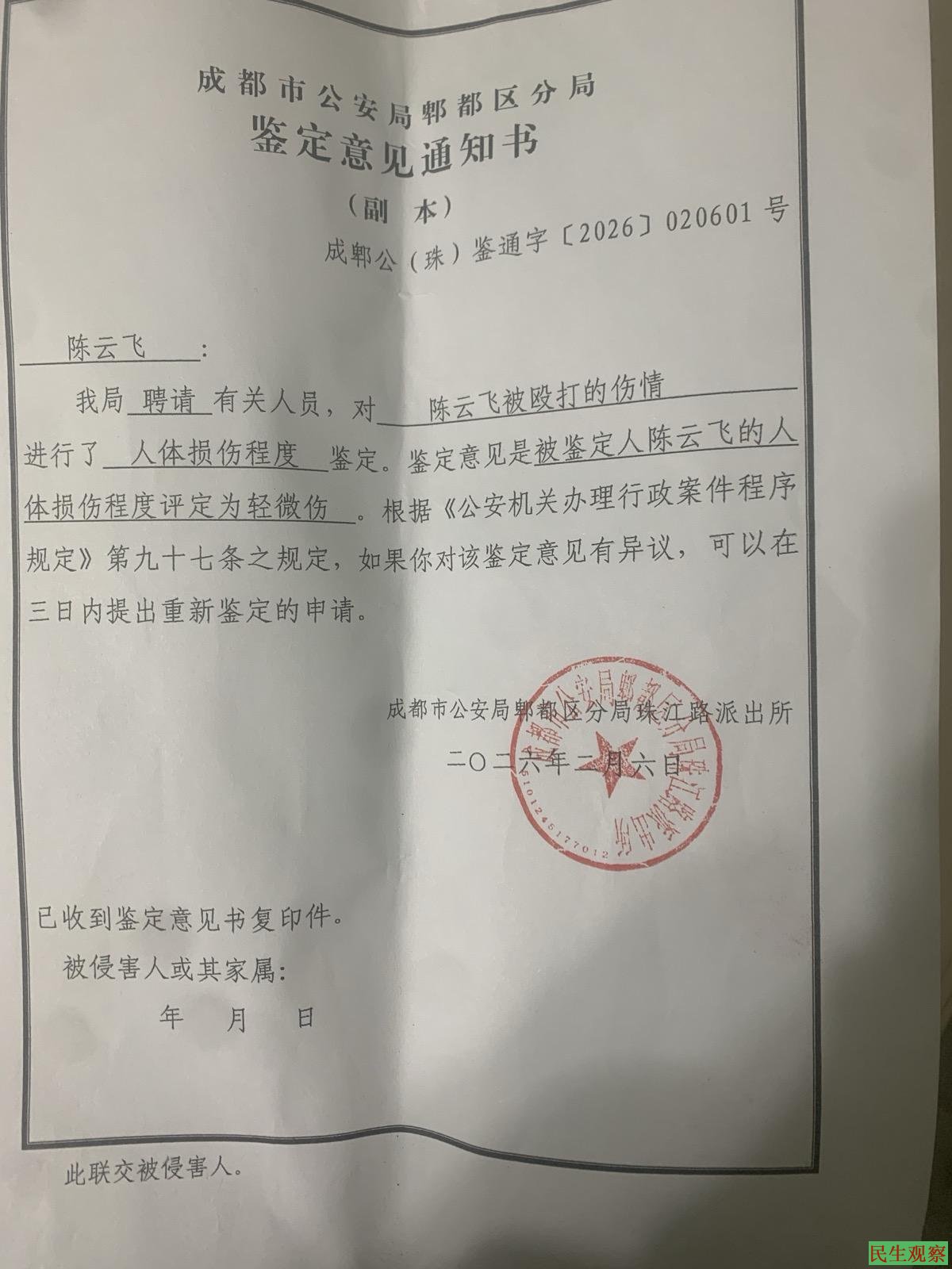 2月6日伤情报告出来,警方发短信告诉陈先生,说是轻微伤。