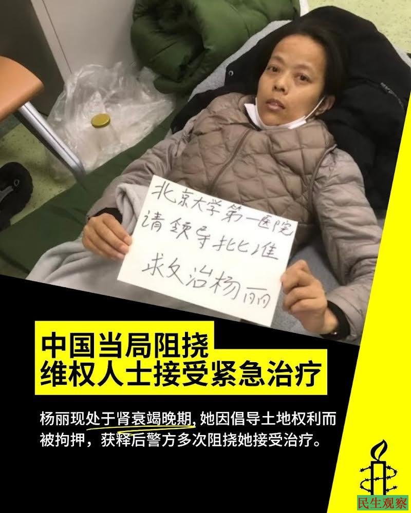 为此,杨彩英强烈呼吁,以习近平为首的中共高层,应立即制止江苏当局的这种反人道行为,依法保障杨丽一家人的就医与通讯权利。