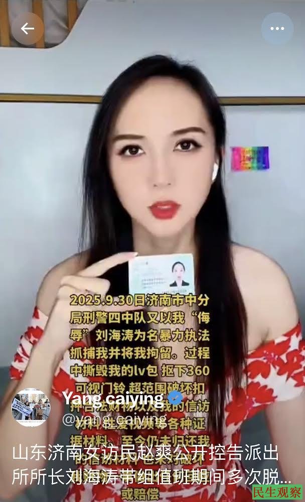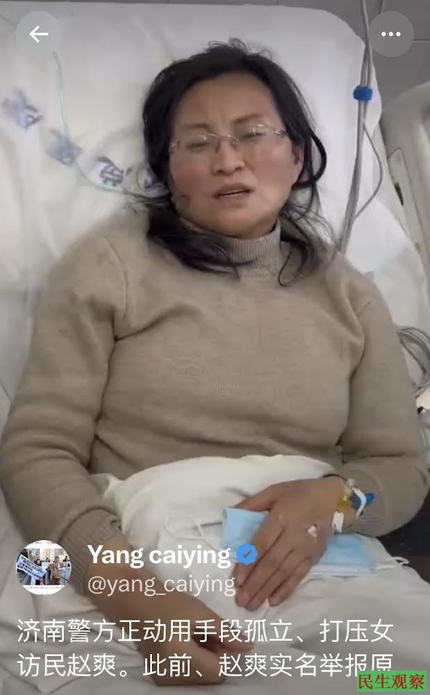 【民生观察2026年3月13日消息】近日,山东济南警方正动用手段孤立、打压女访民赵爽和其朋友薛跃。薛跃因与赵爽聚餐后,被白马山派出所强行带走传唤,理由为她可能去北京上访,在扣押期间薛跃晕倒,后被送往医院治疗,其身上800元现金不知所踪,多次报警无果。此前,赵爽曾实名举报原白马山派出所所长刘海涛在截访、维稳过程中对其“白嫖”,随后遭到报复。