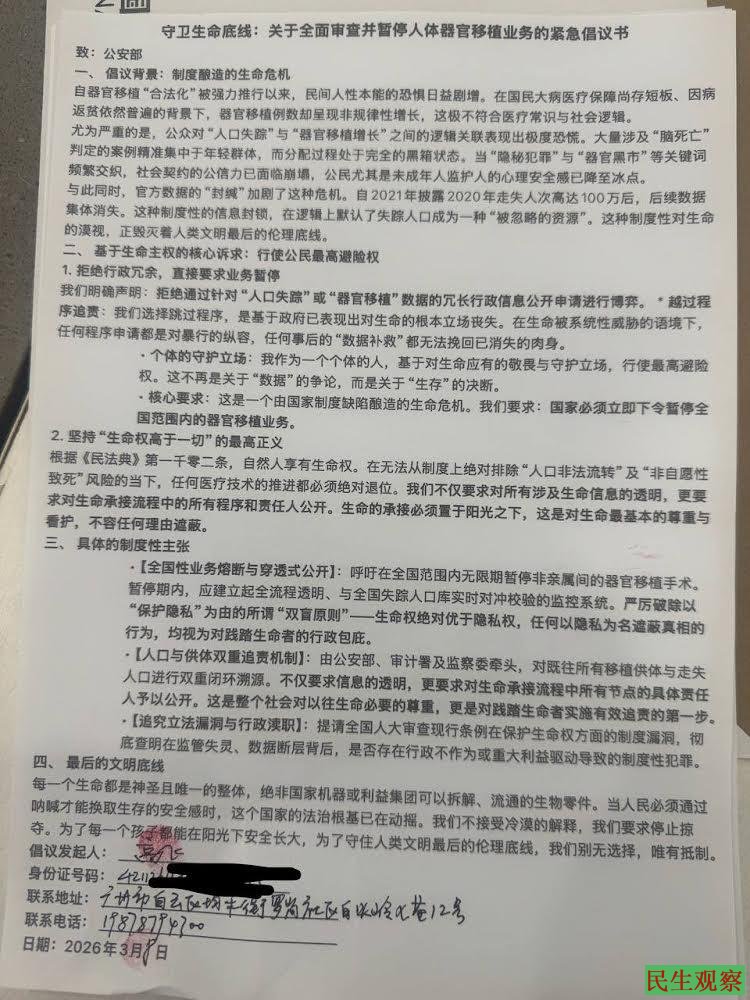 【民生观察2026年3月20日消息】今年3月上旬,现居广州白云区的湖北蕲春青年高飞,向有关国家机关正式邮寄《守卫生命底线:关于全面审查并暂停人体器官移植业务的紧急倡议书》,现显示相关邮件已签收。随后,高飞接到广州白云区公安局电话,告知公安部已接收到该倡议书。近日,高飞有接到老家村委的电话,告知近期将有蕲春公安及村镇人员抵粤约见。