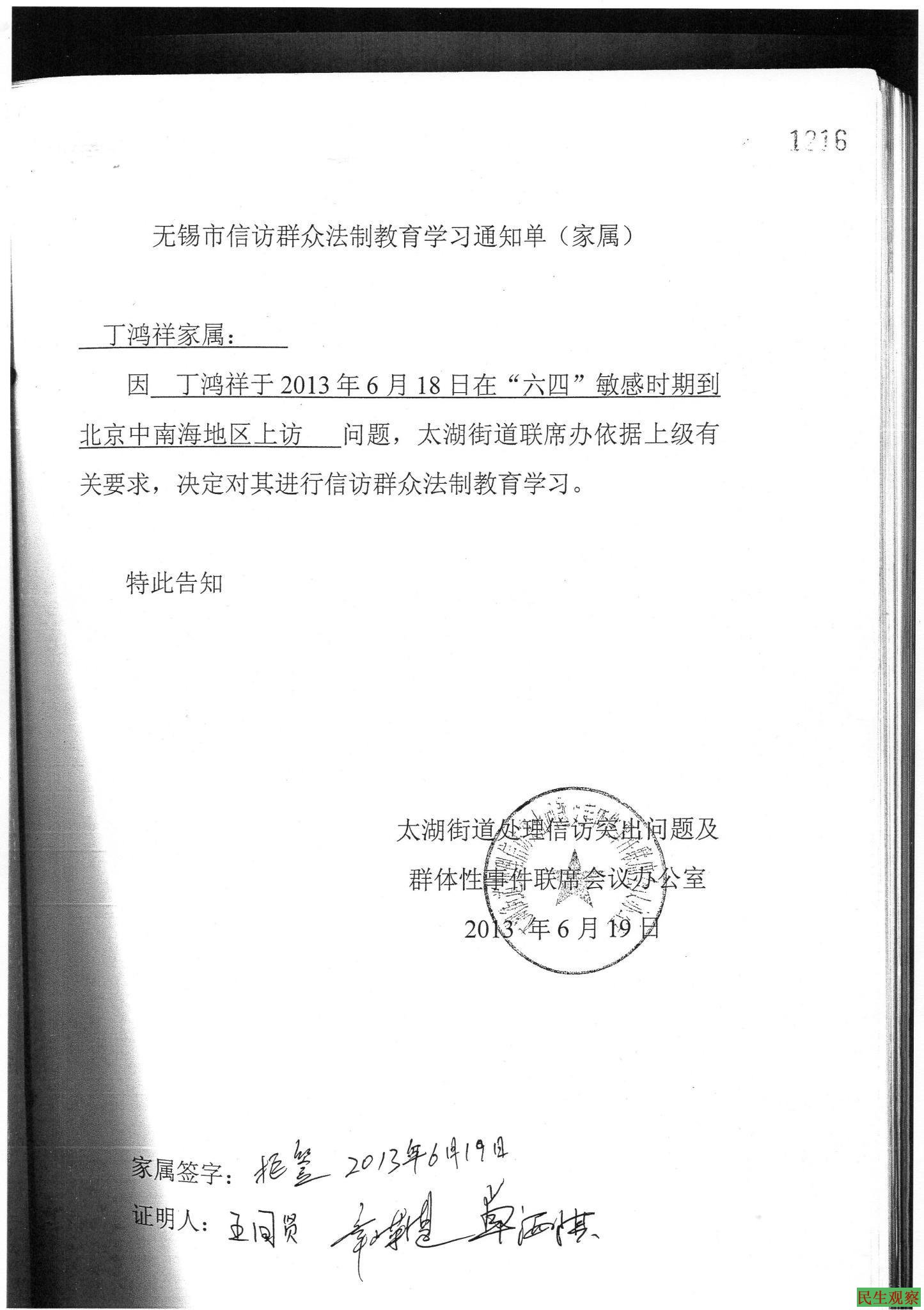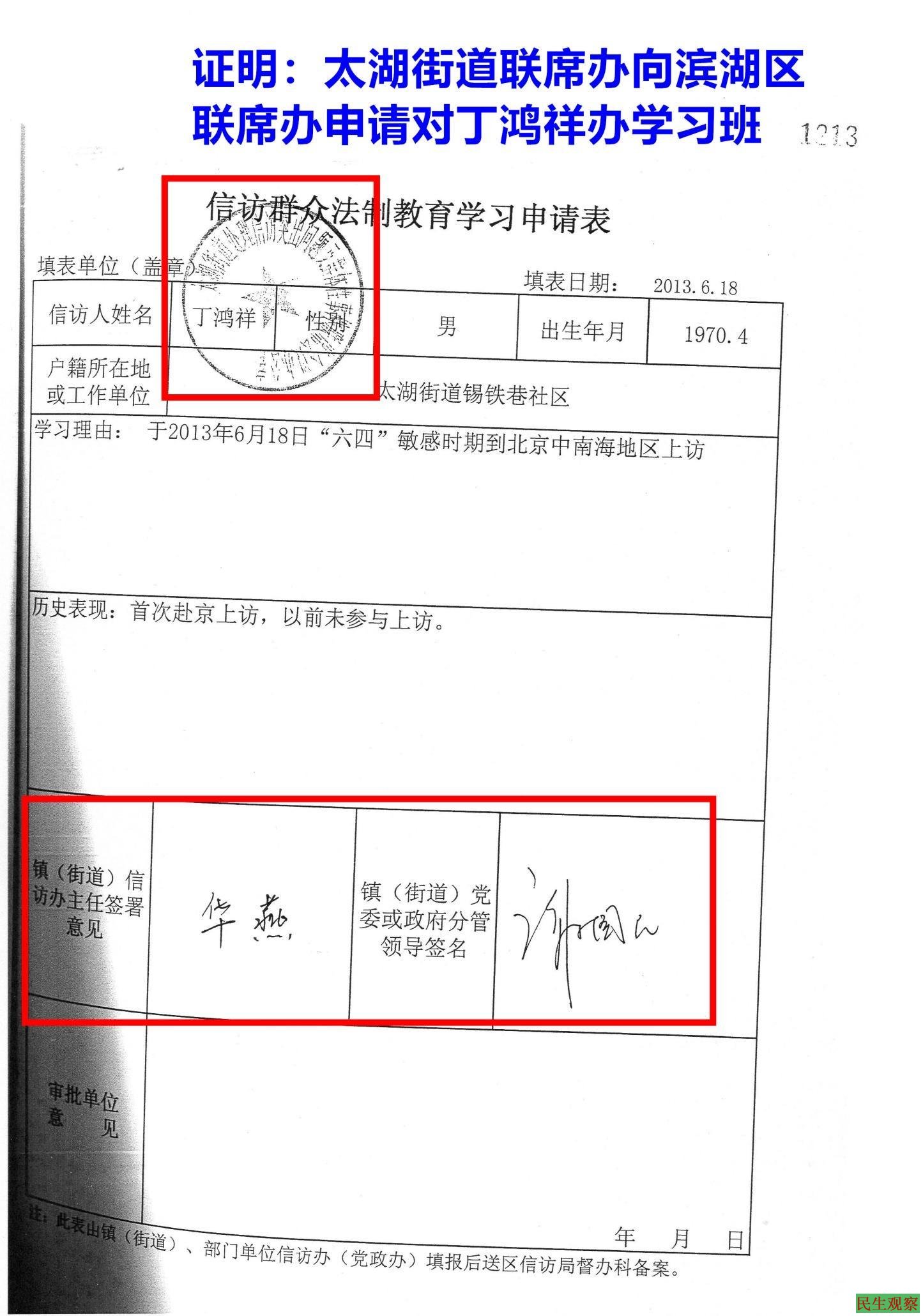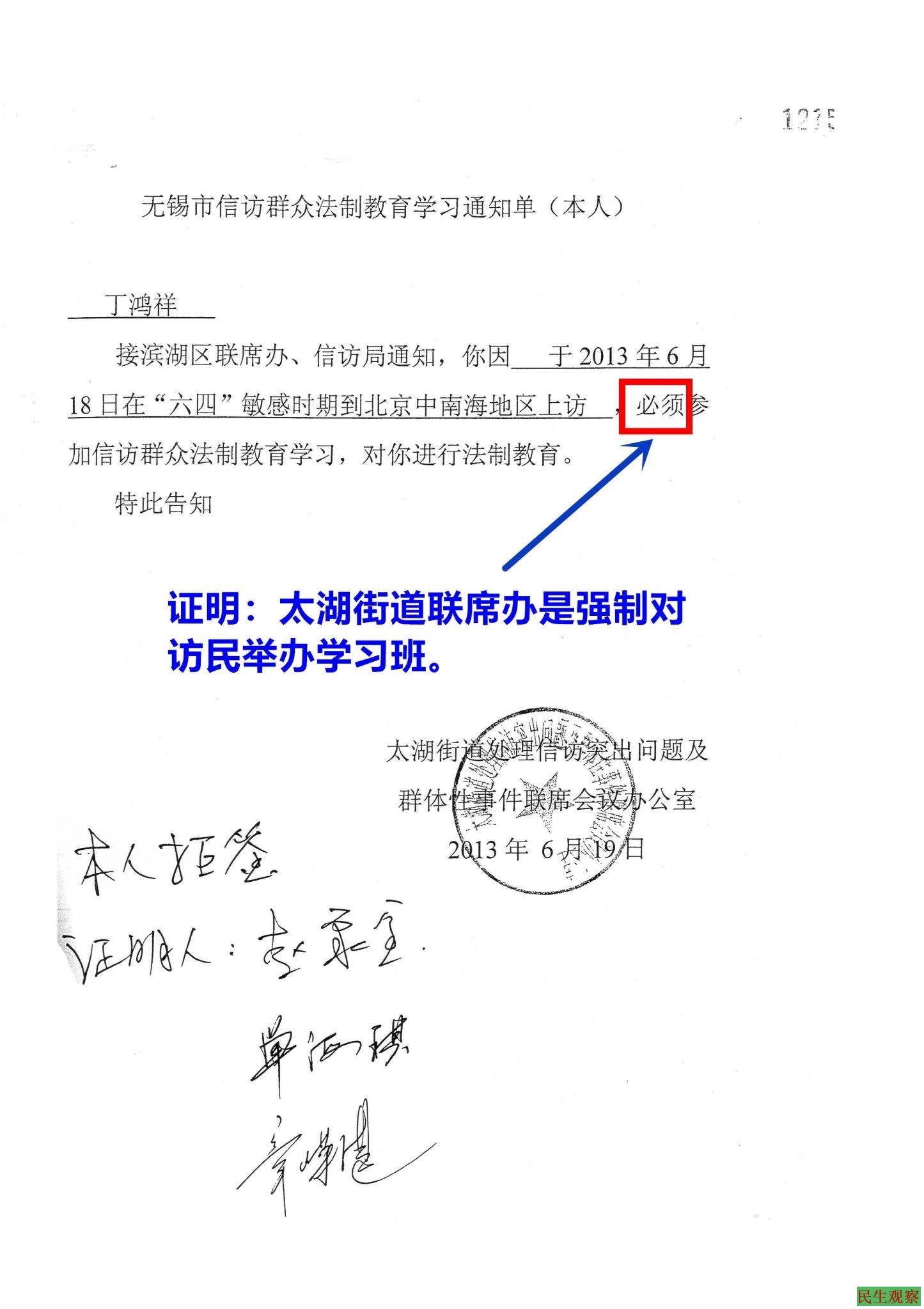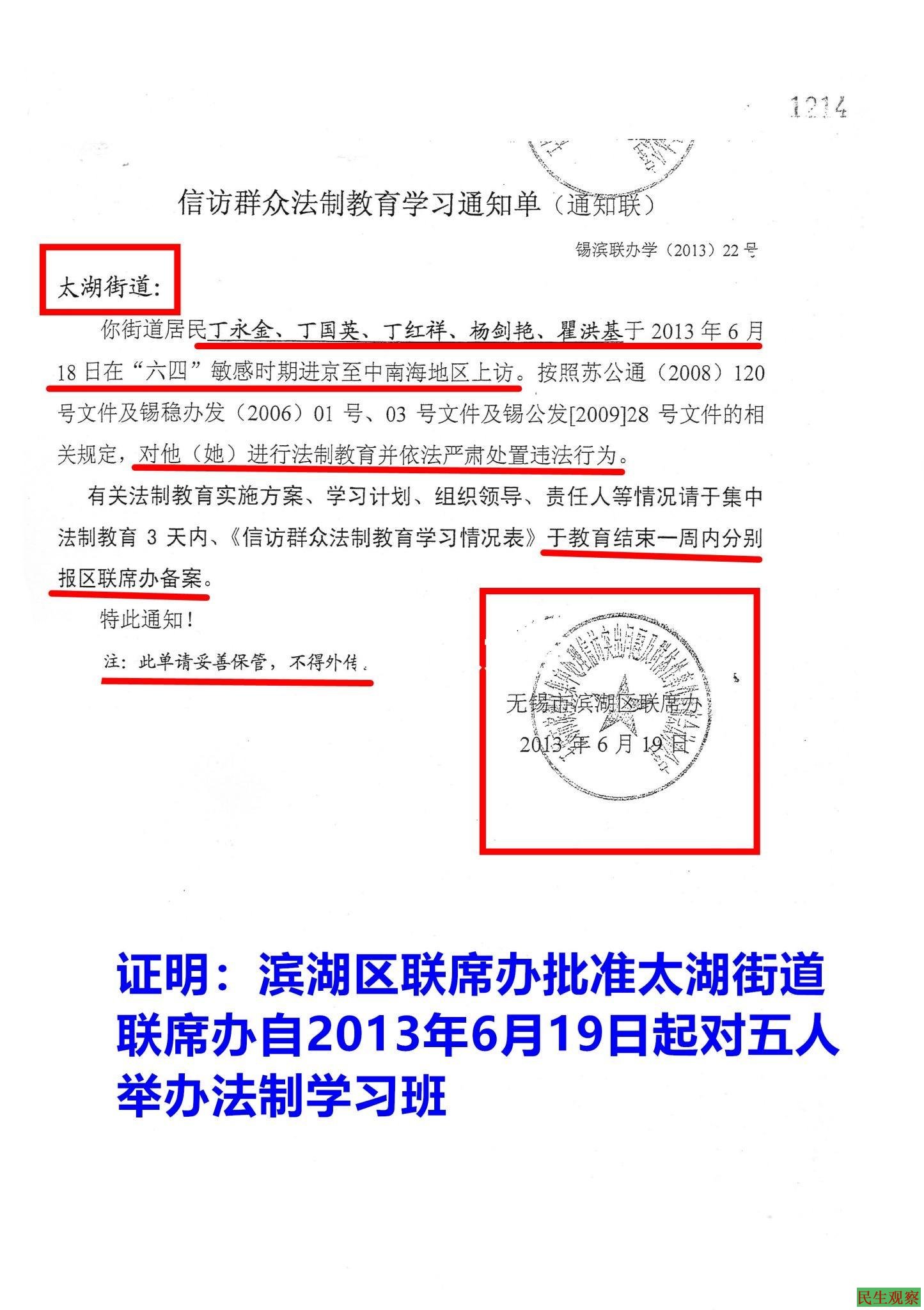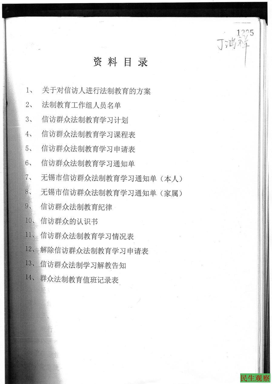 通过多方努力,我们获取到无锡市联席办、滨湖区联席办和太湖街道联席办2013年6月19日对滨湖区五位进京访民(丁国英、丁永金、杨剑艳、周静娟、丁鸿祥)举办“信访群众法制教育学习班”时制作的《信访群众法制教育学习资料》(见附件,以丁鸿祥的为例),五人的《信访群众法制教育学习资料》内容要件基本一致,均为14项内容,这也是迄今为止,全国范围内发现的首例官方“信访群众法制教育学习班”(黑监狱)的文字材料,对研究和揭露那一历史时刻中共无锡的罪恶,具有深刻历史和现实意义。