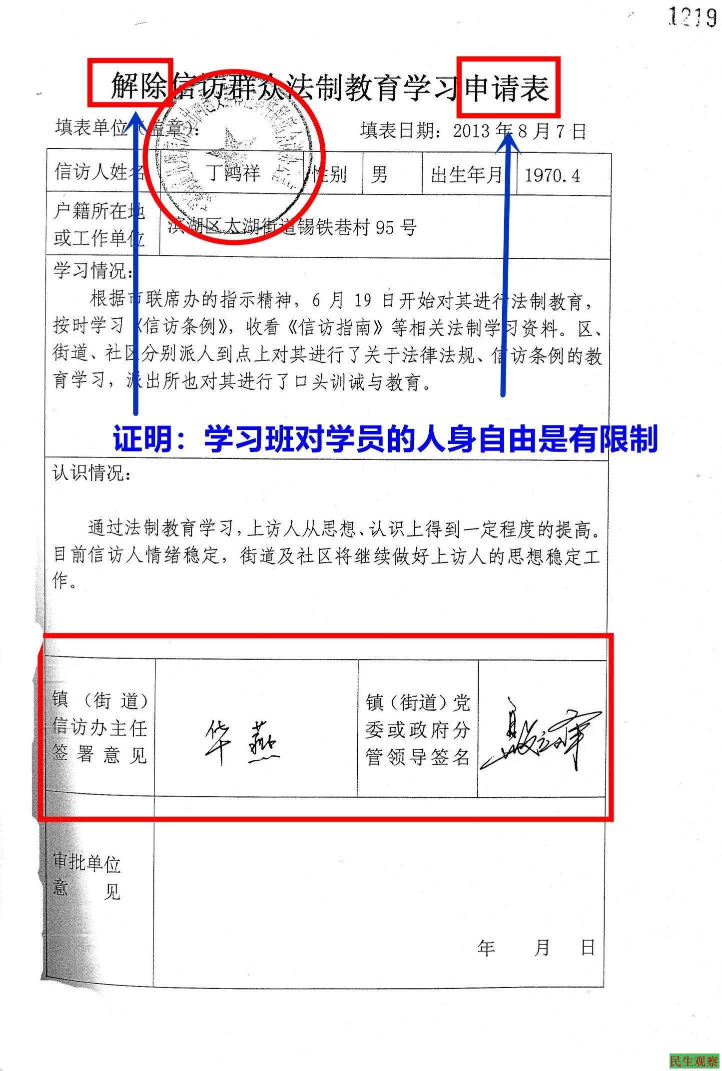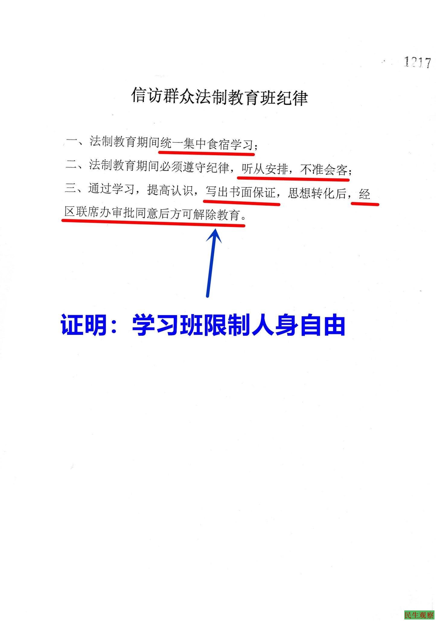从第9项《信访群众法制教育纪律》即可看到,学员被“强制集中”到一个“秘密地点”,不准会客,必须经联席办审批同意后方可解除教育。实际操作时,学员的所有随身物品是全部被抢走,不仅是不准会客,还不得与外界通讯联系,手机全部被抢。第12项《解除信访群众法制教育学习申请表》和第13项《信访群众法制学习解教告知》与第9项相印证,证明学习班强制秘密非法拘禁访民的事实。 据了解,中共无锡强制对访民举办“学习班”达到1000人次,有的访民一人就被举办十次以上。