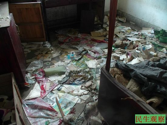 民生观察工作室2013-7-16消息:昨天,宜宾兴文县原教师进修学校76岁高龄的退休高级讲师周老师开始向政府多个有关部门举报:7月14日下午1点过,她返回自己在僰王山镇的家中时,被眼前的一幕惊呆了,只见自家房门四处洞开,屋内狼藉一片,稍微值钱的东西都被洗劫一空。“那情景就像文革时期被红卫兵抄家”,周老师感到阵阵悲凉。据他说,因为这里要拆迁,他从成都赶回来,上午才与兴文县教育局的领导商谈拆迁安置补偿的事宜。没想到,下午一回到家看到的就是这样一幅凄凉的让人伤心欲绝的情景。这让他既愤怒又困惑,不能不将此次洗劫与拆迁联系在一起。