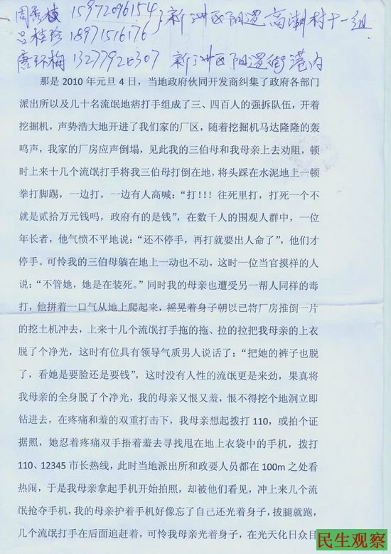 2010年1月4日,三、四百人的强拆队伍突然来到二家的厂区强行拆房。吕桂珍上前阻止时,十几个打手当即将她打倒在地一不动。同时,周秀芝也遭人毒打,她拼着一口气奔向推她家厂房的挖掘机时,十几个流氓上来阻止扯掉了她的上衣,这时一领导模样的人说“把她裤子也脱了,看她是要脸还是要钱”。这时上来几个流氓竟真将周秀芝脱了个精光。