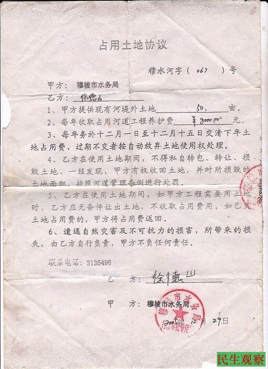 5, 2010年1月8日,穆棱市水务局与徐德山签订了《穆水河字(017)号》50亩河堤外土地占用协议。