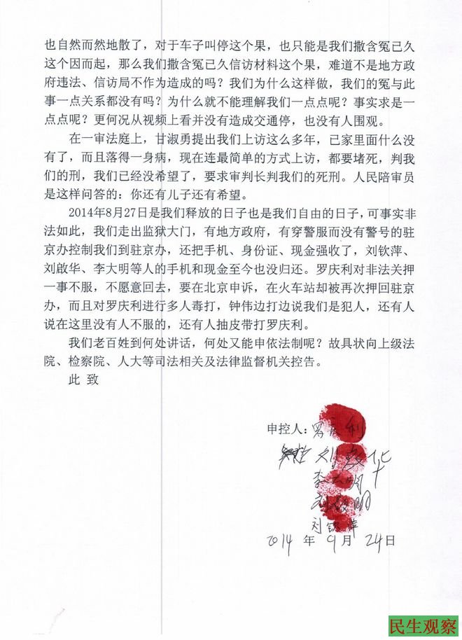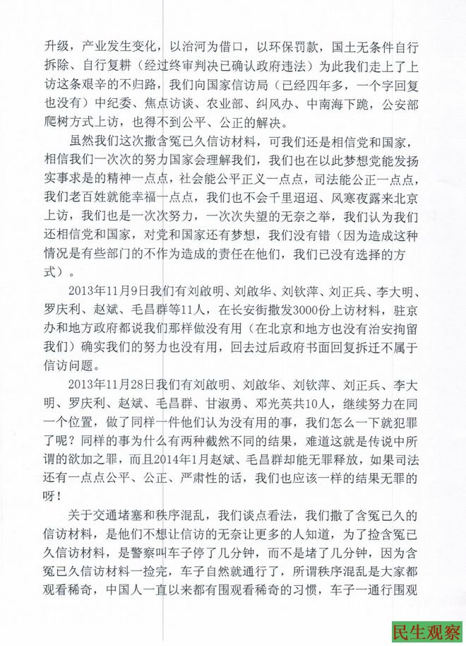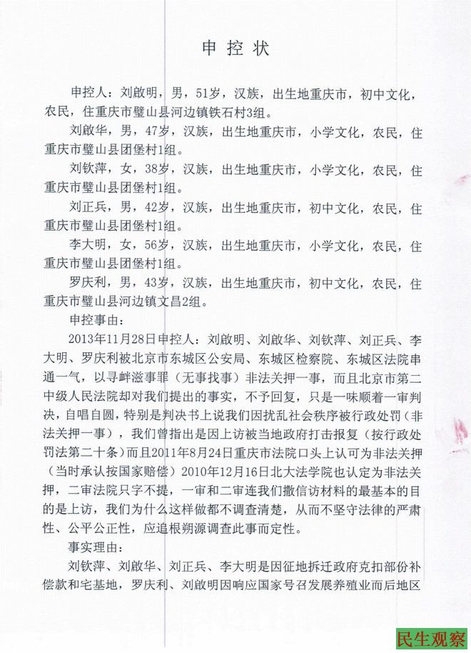 重庆刘啟明等多位访民就天安门撒传单被关押的申控状