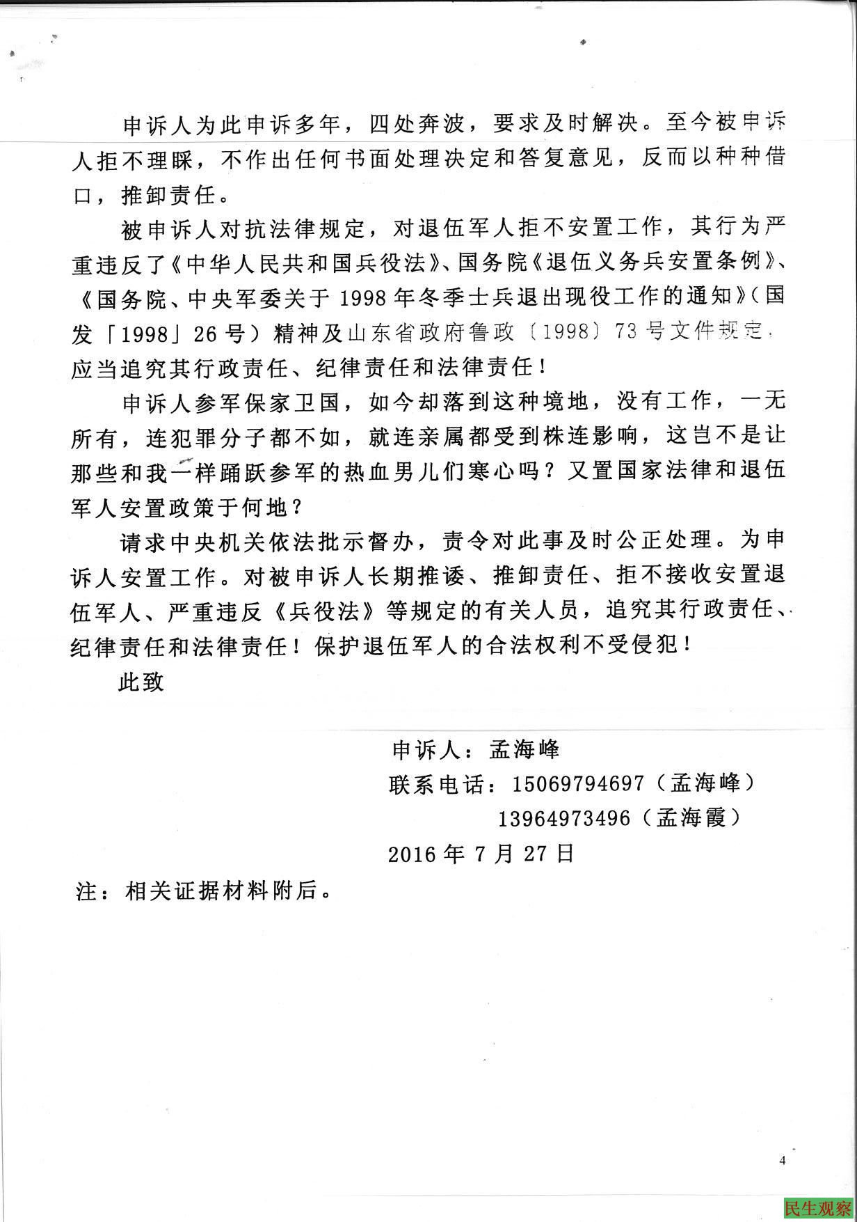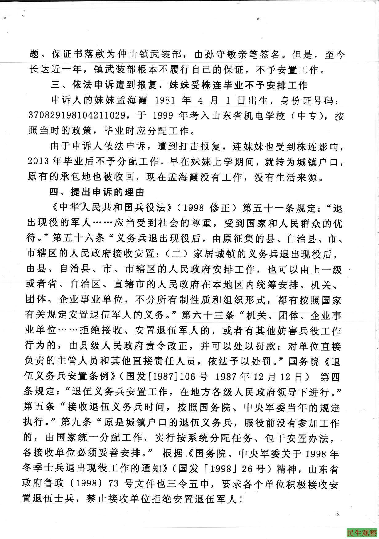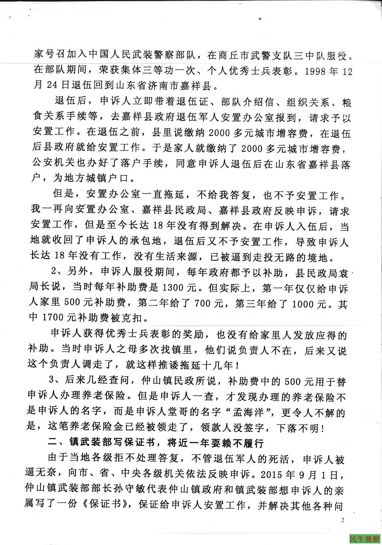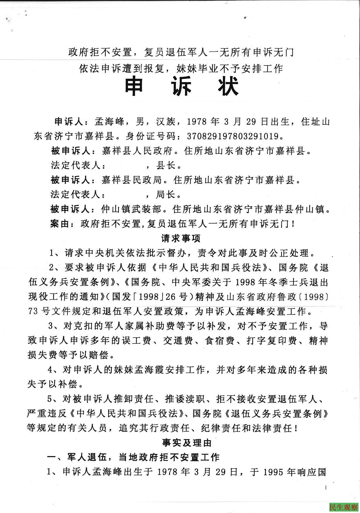 山东省嘉祥县退伍军人孟海峰十八年无安置