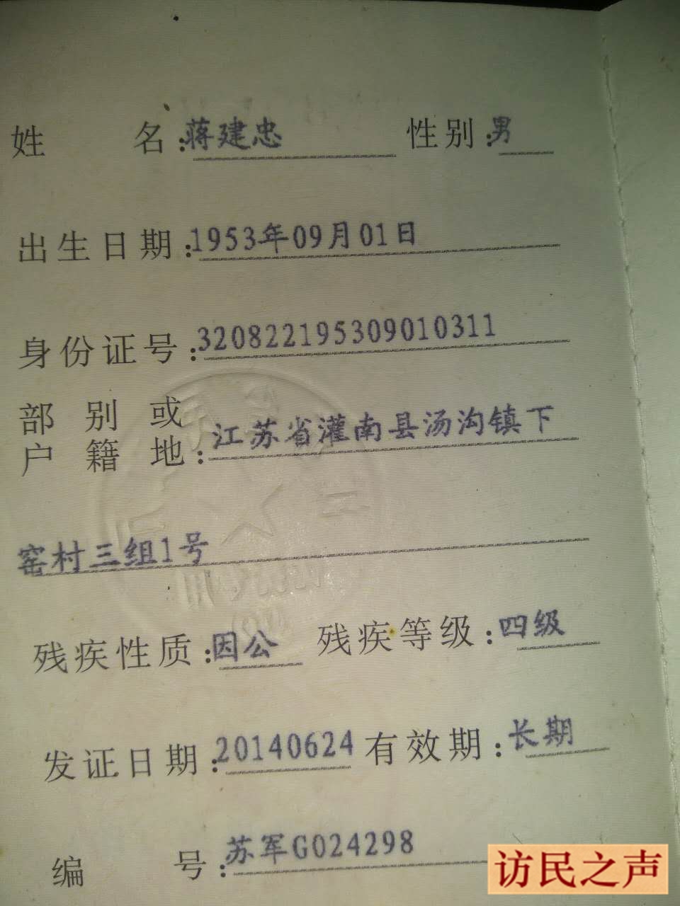 江苏省灌南县因公四级残疾军人:蒋建忠