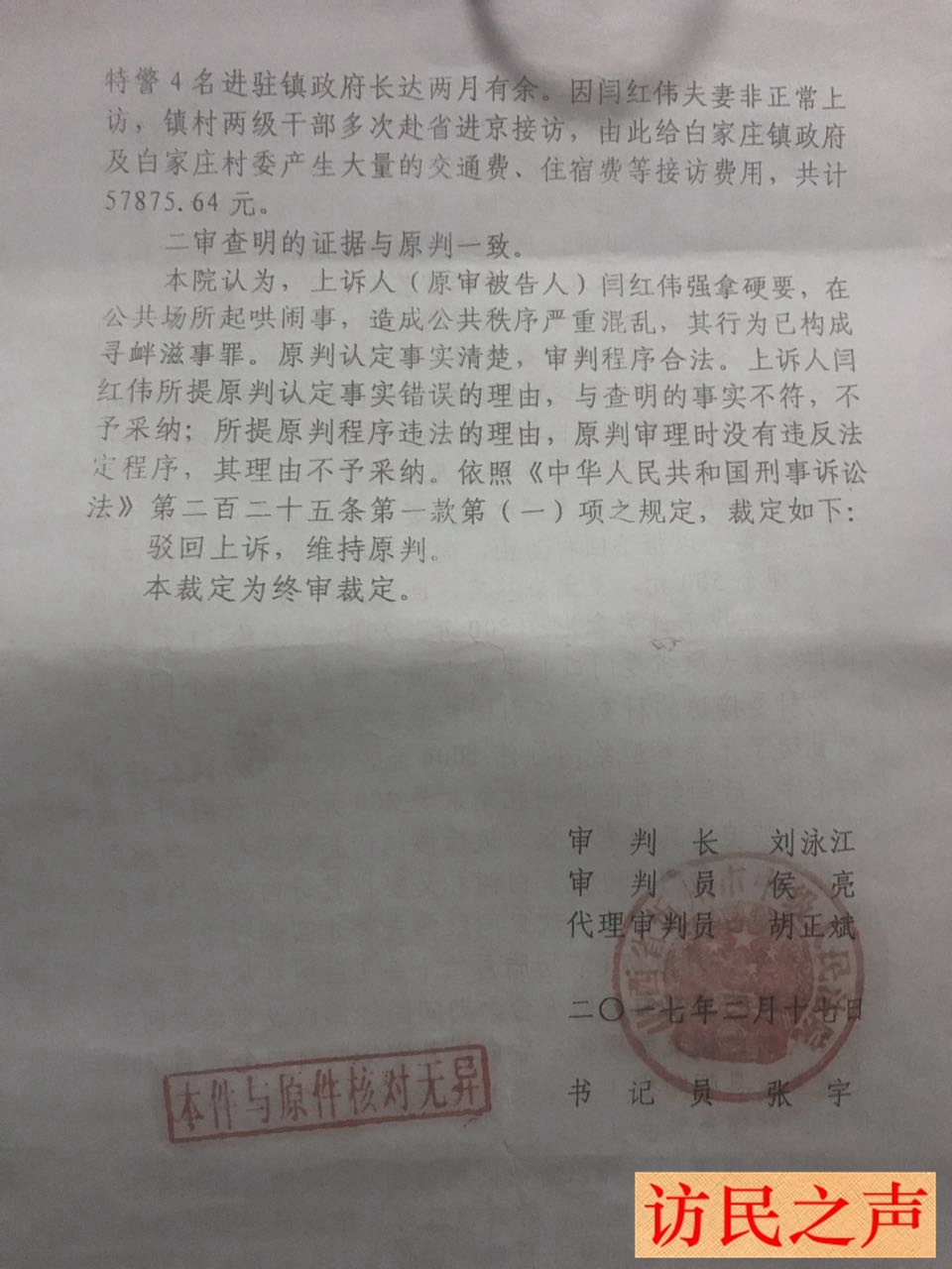 五台县法院判决书中显示,闫红伟是因强拿硬要截访人员财物,多次“非访”在公共场所起哄闹事,其行为构成寻衅滋事罪而被判刑。