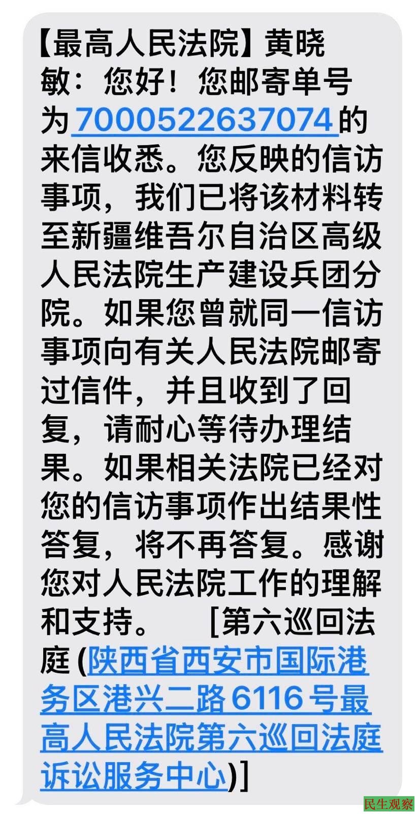 同一天下午,我的手机短信平台收到最高人民法院短信,收到有关为黄云敏申诉的材料,已转至兵团分院,请耐心等待。感谢您对人民法院工作的理解和支持。
