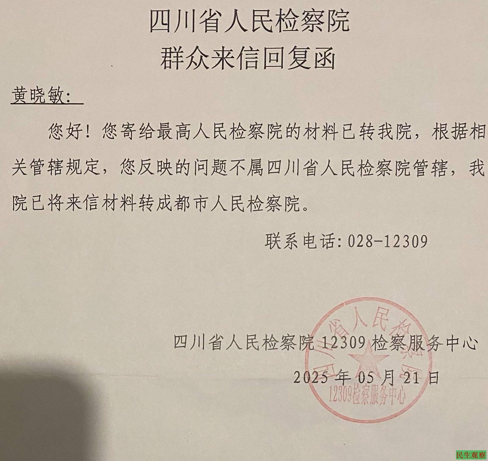 | 黄晓敏在锦江监狱写给成都金牛检察院的申诉信 |