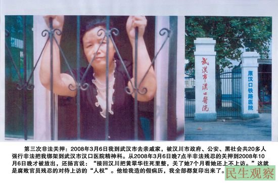 第三次,2008年3月6日,黄翠华到武汉的哥哥家,被长期跟踪黄翠华的人电话告知政府,说:“黄翠华到武汉去了。”于是,政府开了一辆车,带着20多人,从其哥哥家将黄翠华抓住,押往武汉市汉口医院精神科。因医院知道黄翠华的情况,对黄翠华说:“我们不关你,只要你每天晚上回来休息就行了。”黄翠华就每天搭车到武汉车站找人打麻将。期间,黄翠华偷出并复印了医院为其做的假病历。直到2008年10月6号,政府才派人将黄翠华接出来。在医院时,政府官员还恶狠狠的对黄翠华说:“把你接回汉川,往死里整,看你还上不上访。”