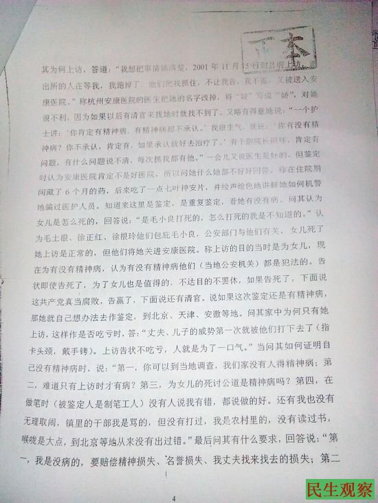 但是,就在徐云娇要求公安机关重新调查毛秋琴死因的情况下,当地公安机关仍旧避开毛秋琴的死亡疑点,坚持原先调查结论,并且不尊重死者及无视其家属的反对,在未对尸体进行验尸之前,与当地政府一起采用推脱欺骗的手段,将死者毛秋琴尸体运到殡葬所火化。为了给女儿讨回公道,徐云姣为此向各级政府和执法机关反映控诉,开始了其从杭州到北京的漫长而又艰难的上访之路。截至目前,徐云娇先后被政府当局和公安机关五次强制送进精神病院。