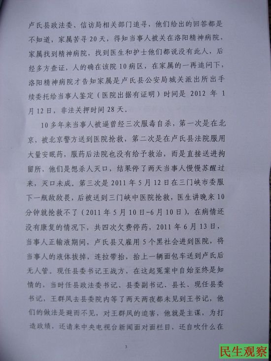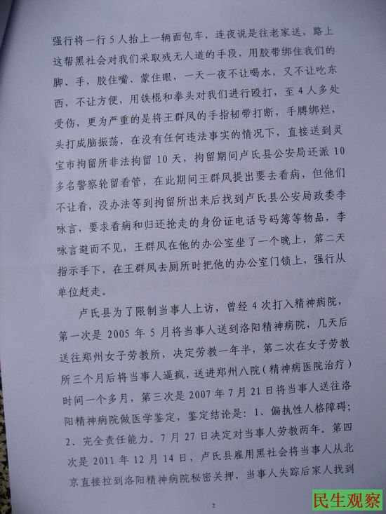 2011年12月14日,卢氏县雇佣社会人将在北京上访的王群凤直接拉到洛阳精神病院秘密关押,家属联系不上她后,多方打探,先后到县政法委、信访局等寻找,他们给出的答复均是不知道。20多天后,家属找到了该医院,然而院方给出的答复也是没有此人,经过家属继续寻求逼问,并证实人在该院10病区后,医院才承认警方确实将她送来关在这里,原来卢氏县公安局城关派出所出了手续给当事人鉴定。这次经过家属努力,被非法关押28天后她获得了自由。