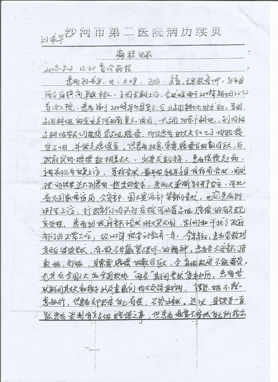 恢复自由后孙书平就到医院去要病例,医院不给,孙书平请了北京的律师,医院才拿出来一份8月4日县信访领导小组刘建功、尹向英、史书军与医院副院长彭伟斌签定的《河北省沙河市精神病医院住院协议书》和住院病例,孙书平称,病例造假。