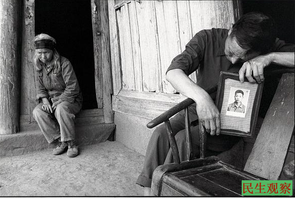 家庭 谢致梅(右)一家四口,妻子(左)及二个孩子都是精神病患者。照片是他死去的儿子,而躺在医院破屋里的女儿谢群英已奄奄一息 四川 1990