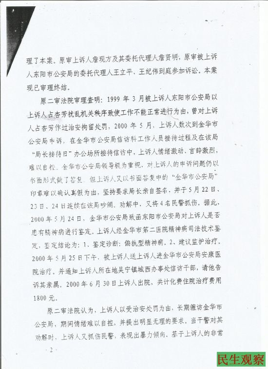 詹现方不服此处罚和前期举报事项的处理,释放后一直找金华市公安局申诉,2000年5月23日被东阳县公安局白云派出所和白云街道办的人给她戴上手铐强制押送到街道办关押,24日早又被戴上手铐押送到金华市第二医院进行精神司法鉴定后把她关进了东阳市戒毒所,在受人指使后吸毒人员开始殴打她,25日她又被以患有偏执型精神病为由送进了金华市公安局安康医院。