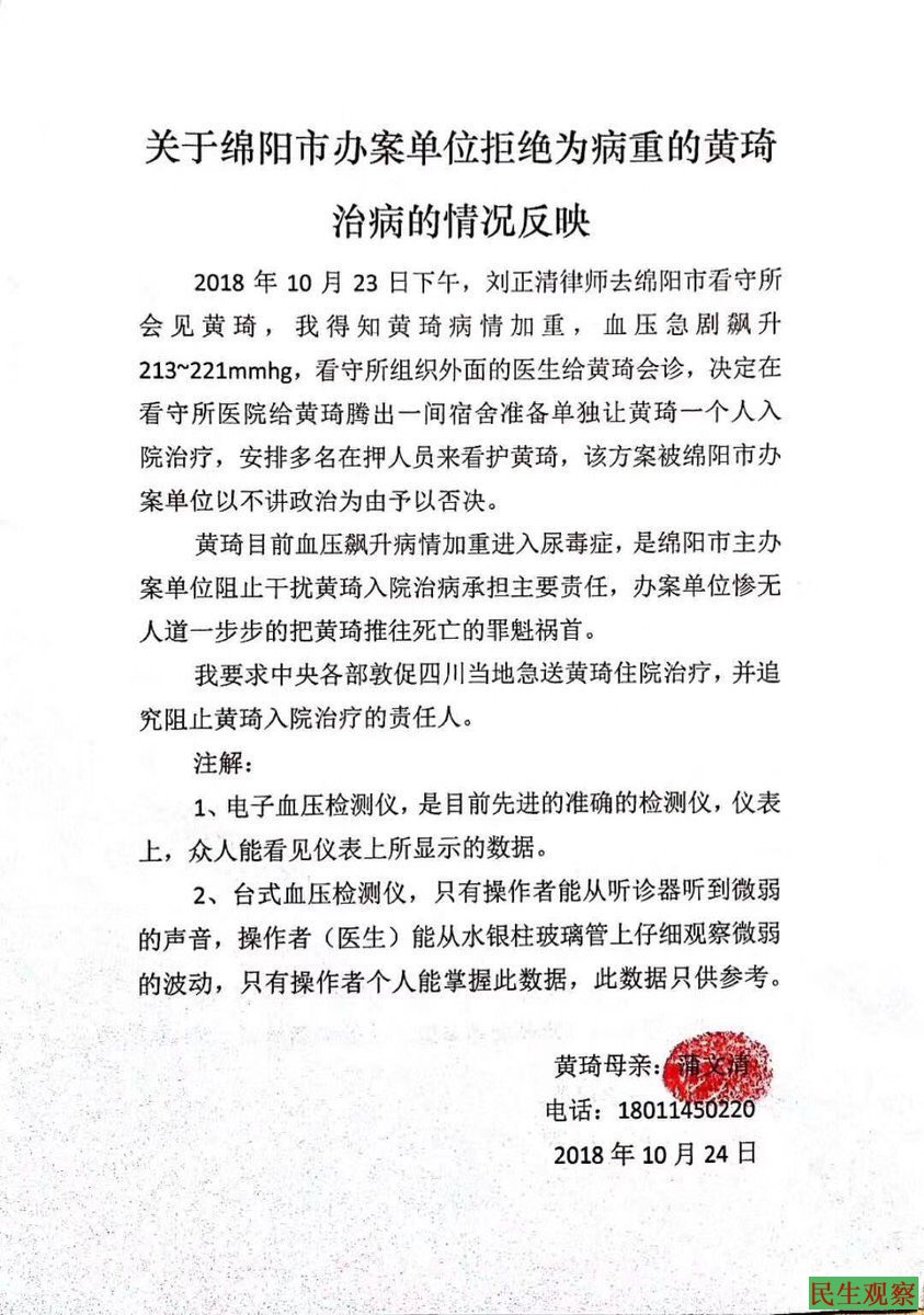 黄琦母亲蒲文清老人日前向当局发出一份情况反映书,指绵阳市公安局(办案单位)拒绝为病重的黄琦安排治疗,是惨无人道一步一步将黄琦推向死亡的罪魁祸首,恳请当局敦促绵阳市警方尽快将黄琦送医救治并追究阻止责任人的责任。