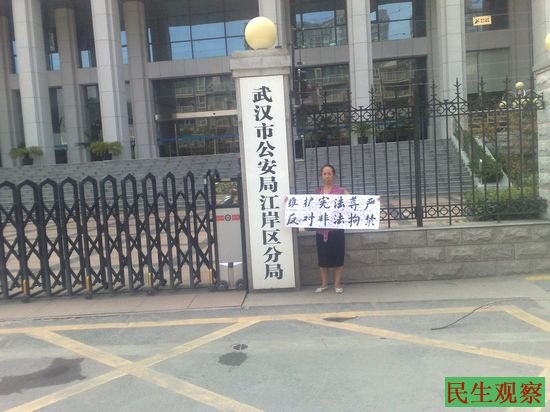 另外,武汉访民程雪因为丈夫胡国红被精神病上访,多次遭到非法关押。今天上午,程雪来到武汉市公安局江岸区分局举牌抗议这种非法行为。程雪今天的抗议标语是“维护宪法尊严 反对非法拘禁”。