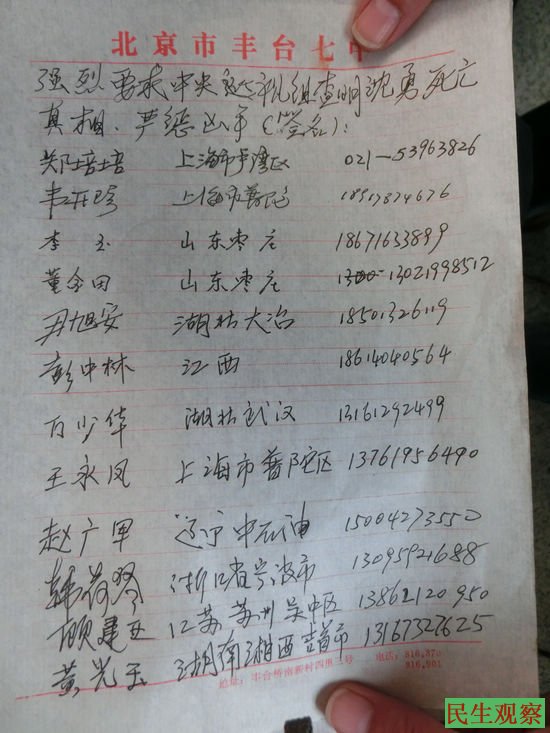 全国各地在京维权访民:上海郑培培、韦开珍、朱金娣、金月花、王永风、陶建国、陆善明、陶永芳、项文寅、吴玉芬、江西彭中林、湖北尹旭安、万少华、山东李玉、董今田、辽宁赵广军、湖南黄光玉、浙江韩荷琴、江苏顾建亚、黑龙江杜寿艳、沈福田、河南刘红霞等聚集南站联署签名,再次强烈要求中央巡视组查明沈勇死亡真相、严惩凶手。