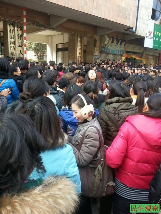 民生观察工作室2014-1-14消息:昨天(1月13日)上午,湖北省荆门市沙洋县的千余名教师陆续聚集到沙洋县政府门口示威抗议,到场的老师们高举着“反对盘剥,反对克扣,还我血汗钱”的横幅分四个团队涌到了县委的门前。随后就来了很多警察,他们分两派五六米一个。据荆门维权人士刘女士和沙洋维权人士王女士反映,昨天沙洋县部分教师在县政府门前示威抗议,要求按政策增加工资。上午10点只有一两百人,后来人就越来越多。据说,有个学校大门被校长锁住了,老师们翻院墙赶往城区。昨天沙洋县政府有人演讲,附近的交通都因此被阻断,据悉还有一辆交警车被掀翻。教师们说,沙洋县委、县政府的官员们曾要求公安、教育、文化、政府等部门的干部去阻挠、劝解老师们不要参与罢课抗议,结果有些去劝解的干部私下里却对老师们说:“你们继续请愿吧!你们涨了工资,我们也好跟着涨。”教师们的罢课抗议事件一直持续到昨天旁晚,今天教师们在等待县政府的答复。
