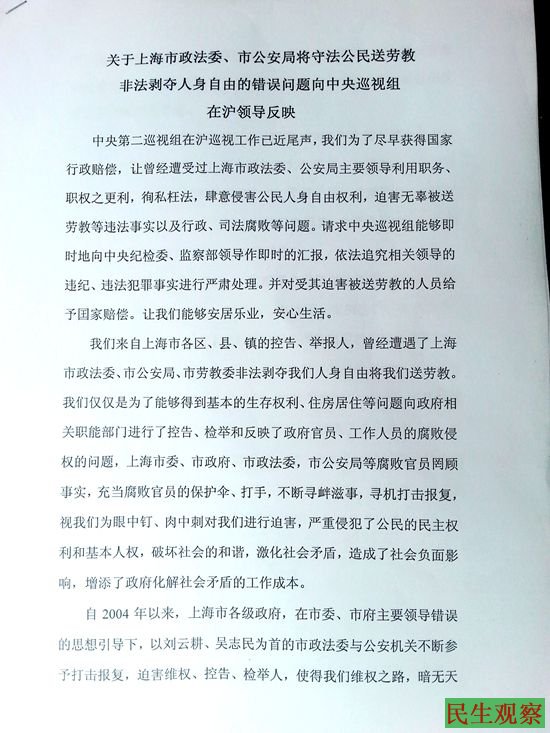 上海民众向中央巡视组控告:劳教不能“国家无答责”