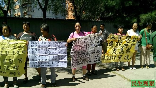 民生观察工作室2015/8/15消息:自7月份大批维权律师被抓后,激起了许多访民的愤怒,今天数十位在京访民打出了“律师挺住,莫以自由为代价充当破坏法制的帮凶”“立即释放维权律师”的条幅。