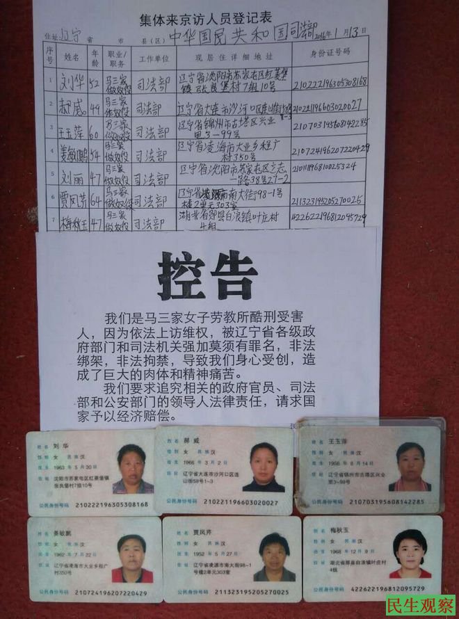 民生观察工作室2016/1/14消息:昨天,来自辽宁沈阳的刘华、刘丽,辽宁大连的赫威、辽宁锦州的王玉萍、辽宁凌海的姜鹏敏、辽宁凌源的贾凤芹和湖北郧县的梅秋玉,集体来到司法部信访接待室,继续控诉当年在辽宁马三家劳动教养院被非法关押及受到虐待。