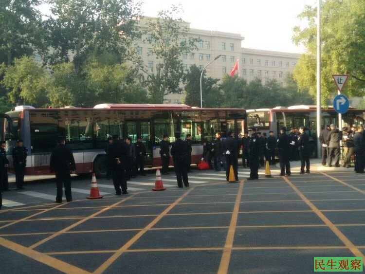 据现场人士发回的信息、图片、视频显示,今天前来的志愿老兵们在中央军委大楼周围绵延数里路,大家打着各地的标语,有秩序地站在马路边,现场红旗招展,军歌飘扬。现场有来自四川的标语,也有来自安徽的标语,有标语写着“河北军转志愿兵 落实军转政策 还我军人尊严”。同时,中央军委大楼一带出现大量警察和警车,以及运送上访人员的大巴车,这些车辆几乎将老兵们包围了起来。还有现场人士说,下午已有十几名老兵代表被抓走了,老兵们要求先放人,他们才能上车到久敬庄。