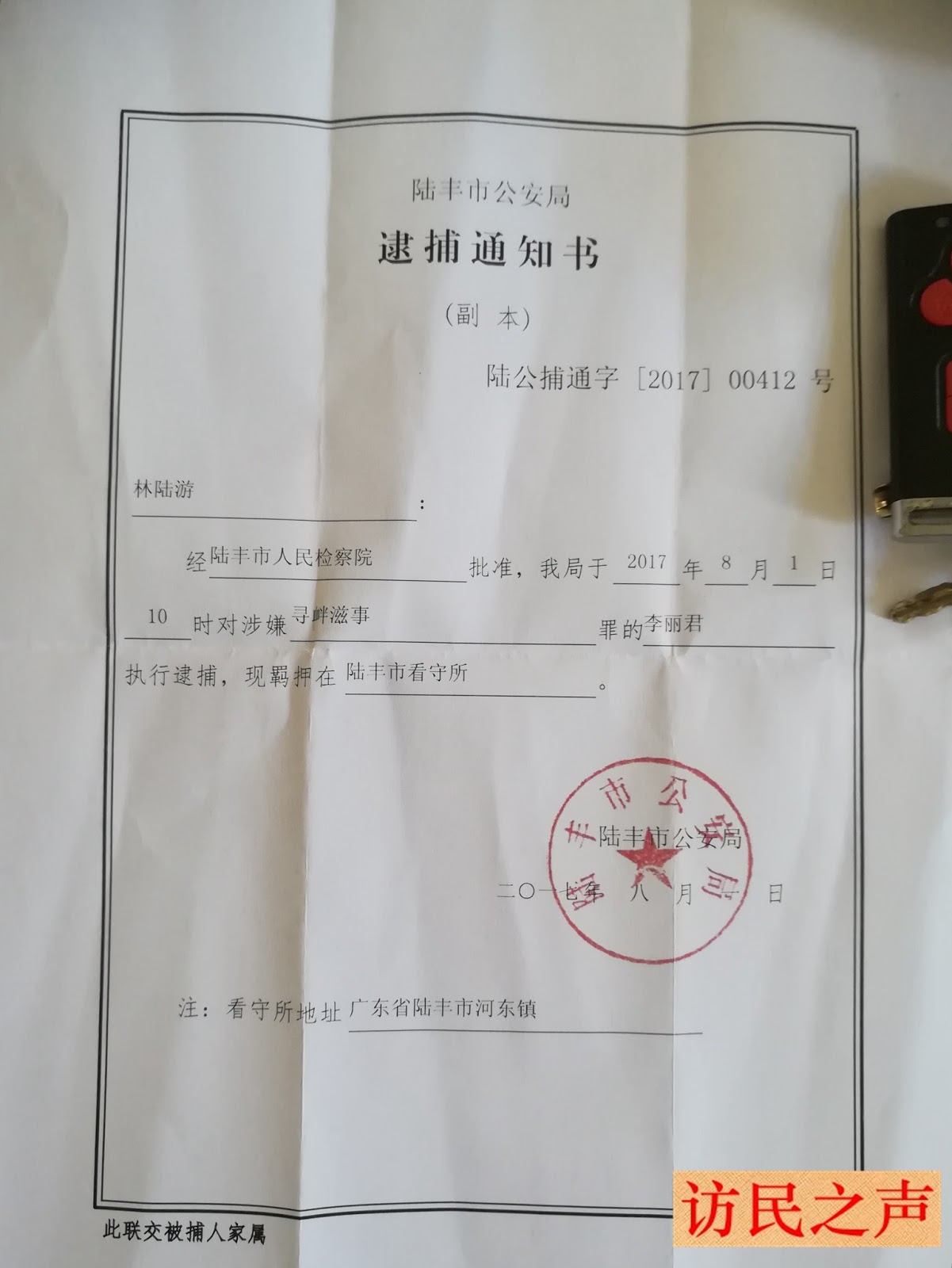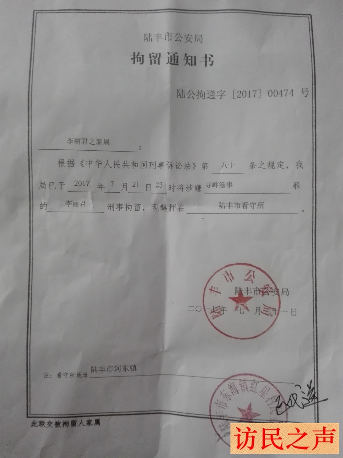 李丽君丈夫林陆游表示, 7月20号23时38分,陆丰市政府官员及东海城北派出所民警、消防人员及国保警察等三十多人,在没有出示任何法律文书及口头传唤告知的情况下强行用液压剪、大锤等工具将门打烂,闯入屋内抓走李丽君和我儿子。在抓捕时将我儿子殴打受伤,后用手铐拷住双手,把她们母子俩一同押上警车。我儿子当天释放回家。李丽君第二天被以寻衅滋事刑拘,前几天我拿到了逮捕通知。7月20号当晚,张惠英在自己家中也被强行将门打烂并抓走。但她家没有收到法律文书。