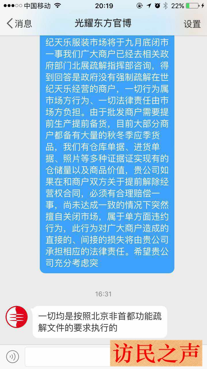 由于光耀东方集团涉嫌欺诈,单方强行撕毁商户们买断的经营使用权,今年8月份还收了商户们一年租金,承诺市场没问题,鼓励大家好好经营。现在就要强行闭市,导致商户们贷款数百万备下的秋冬季货物将被积压。不得已的情况下,两千多商户会把光耀东方集团起诉到法庭,一切损失要光耀东方集团承担。
