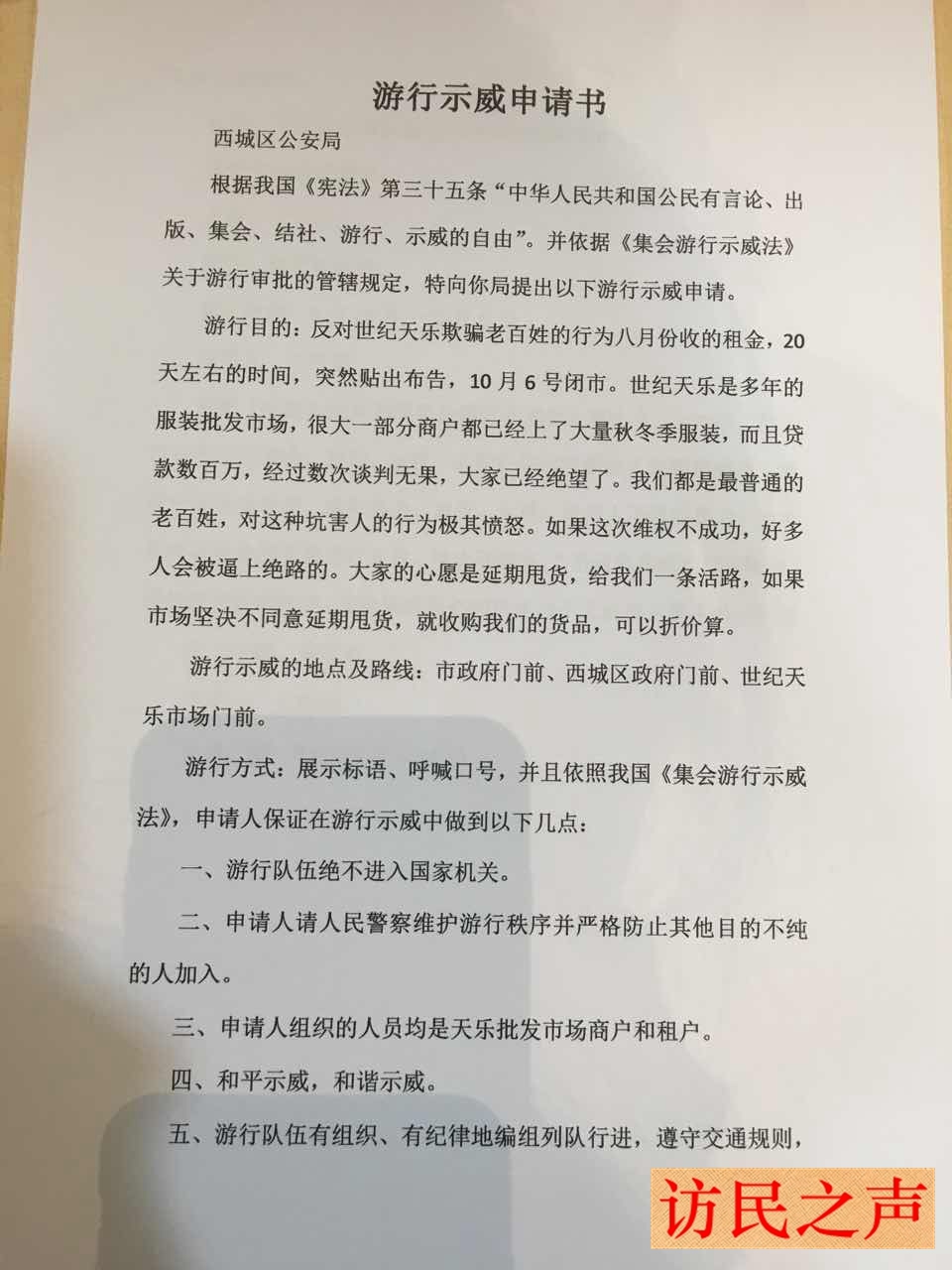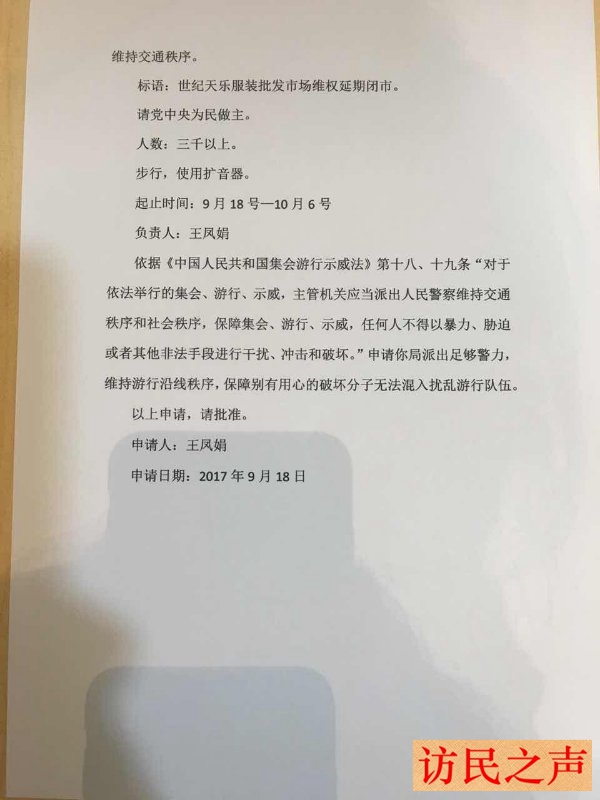 到下午5点,商户们下班时,大批警察和保安早已聚集在市场外等待维稳。而商户们只是像以往一样照常上下班,没有采取任何行为,这些维稳人员仍不肯撤去。商户们为了安全起见,向西城区公安局递交了游行示威申请书,要求延期闭市,给商户们甩货的时间,目前还没有答复。