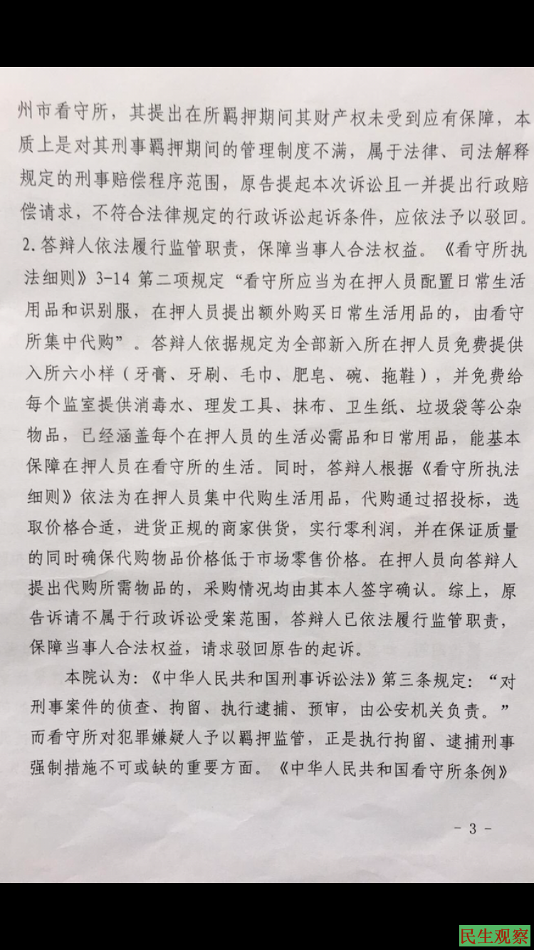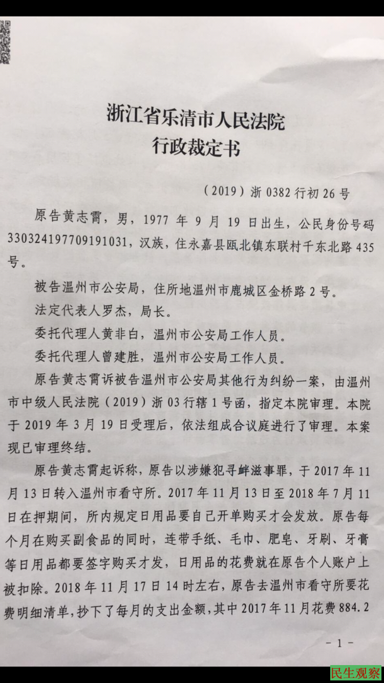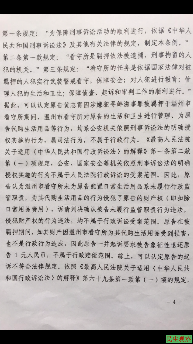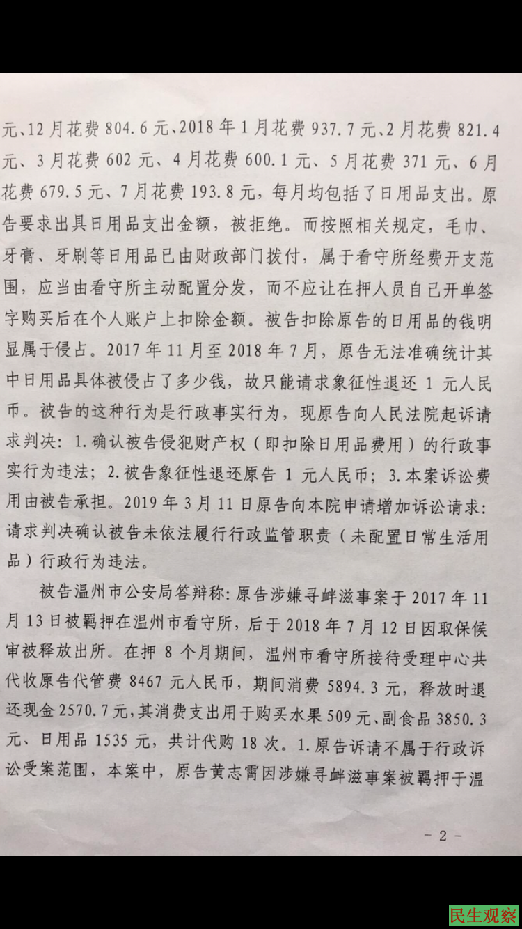民生观察会继续关注黄志霄就温州市公安局看守所未履行监管职责并侵犯财产权一案的相关消息。