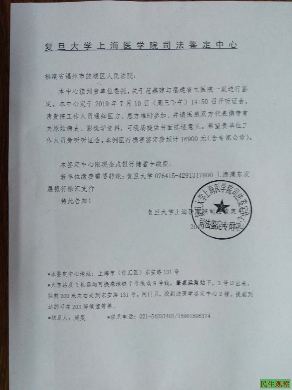 2019年7月10日,范燕琼控诉案的司法鉴定在复旦大学上海医学院司法鉴定中心举行,然而专家团队的鉴定结果认为,范女士案中,福建省立医院并无过错,支架安装完全符合当时患者的实际情况,因此原因和责任不在院方,而后来发生的后果更与院方无关,是范女士自身原因所造成。虽然专家们信口雌黄刻意歪曲事实,对范女士的遭遇利用专业优势进行责任推卸,然而专家们却刻意回避当年那份至今未见的彩超检查结果。而范女士提出当时手术未经自己及家人的签字同意,甚至并不知情,另外,院方为自己安装支架后至今未告知该产品的名称、产地以及品牌等基本信息,但对于范女士提出的多个细节,专家并未理会。