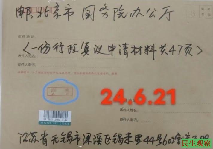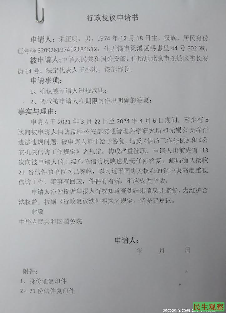 【民生观察2024年7月16日消息】江苏省无锡市维权公民朱正明几十次信访复议事项的信件都没有得到任何回复。近日,朱正明再一次向中华人民共和国公安部申请行政复议,要求公安部在期限内给予明确的答复。