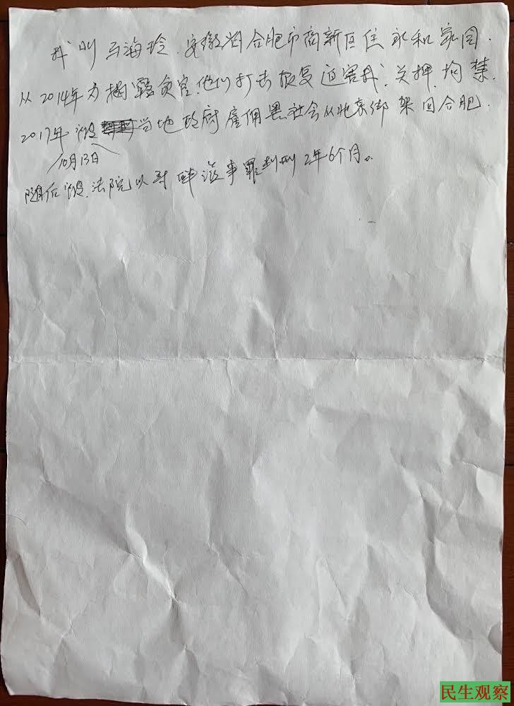 【民生观察2024年9月11日消息】安徽省合肥市高新区马海玲,自2014年开始因揭露官员贪污腐败,被当地打击报复迫害,关押拘禁;2017年10月13日,马海玲被当地政府雇佣黑社会人员从北京绑架回合肥,随后被法院以寻衅滋事罪判刑2年6个月。
