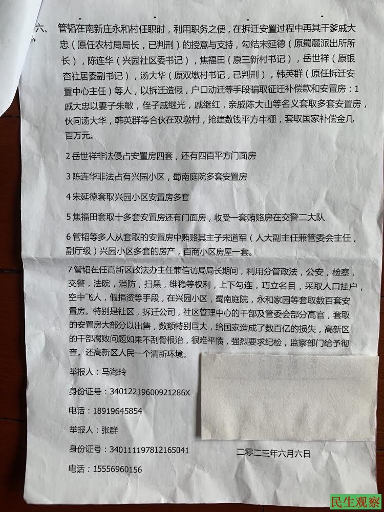 7、管韬在任高新区政法办主任兼信访局局长期间,利用分管政法,公安,检察、交警,法院,消防,扫黑,维稳等权利,上下勾连,巧立名目,采取人口挂户,空中飞人,假捐资等手段,在兴园小区,蜀南庭院,永和家园等套取数百套安置房。特别是社区,拆迁公司,社区管理中心的干部及管委会部分高官,套取安置房大部分已出售,数额特别巨大,给国家造成了数百亿的损失,高新区的干部腐败问题如果不刮骨根治,很难平愤,强烈要求纪检,监察部门给予彻查,还高新区人民一个清新环境。