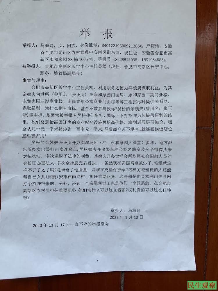 自2020年11月17日开始,马海玲实名一直不停的举报合肥市高新区长宁中心主任吴松,其利用职务之便为其亲属谋取利益,为其亲姨夫何世所(曾用名:张正所)在永和家园门面房、永和家园二期商业楼、永和家园三期商业楼、南岗青年公寓商业门面房等等工程招标时,提供关系网谋取暴利。