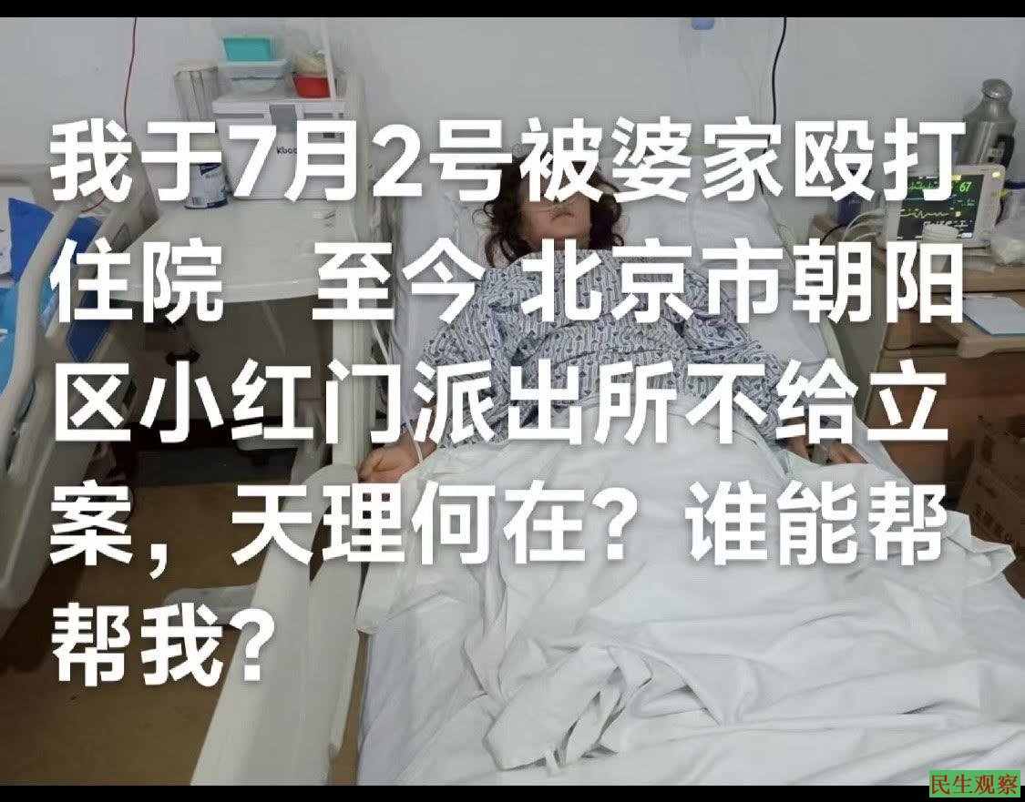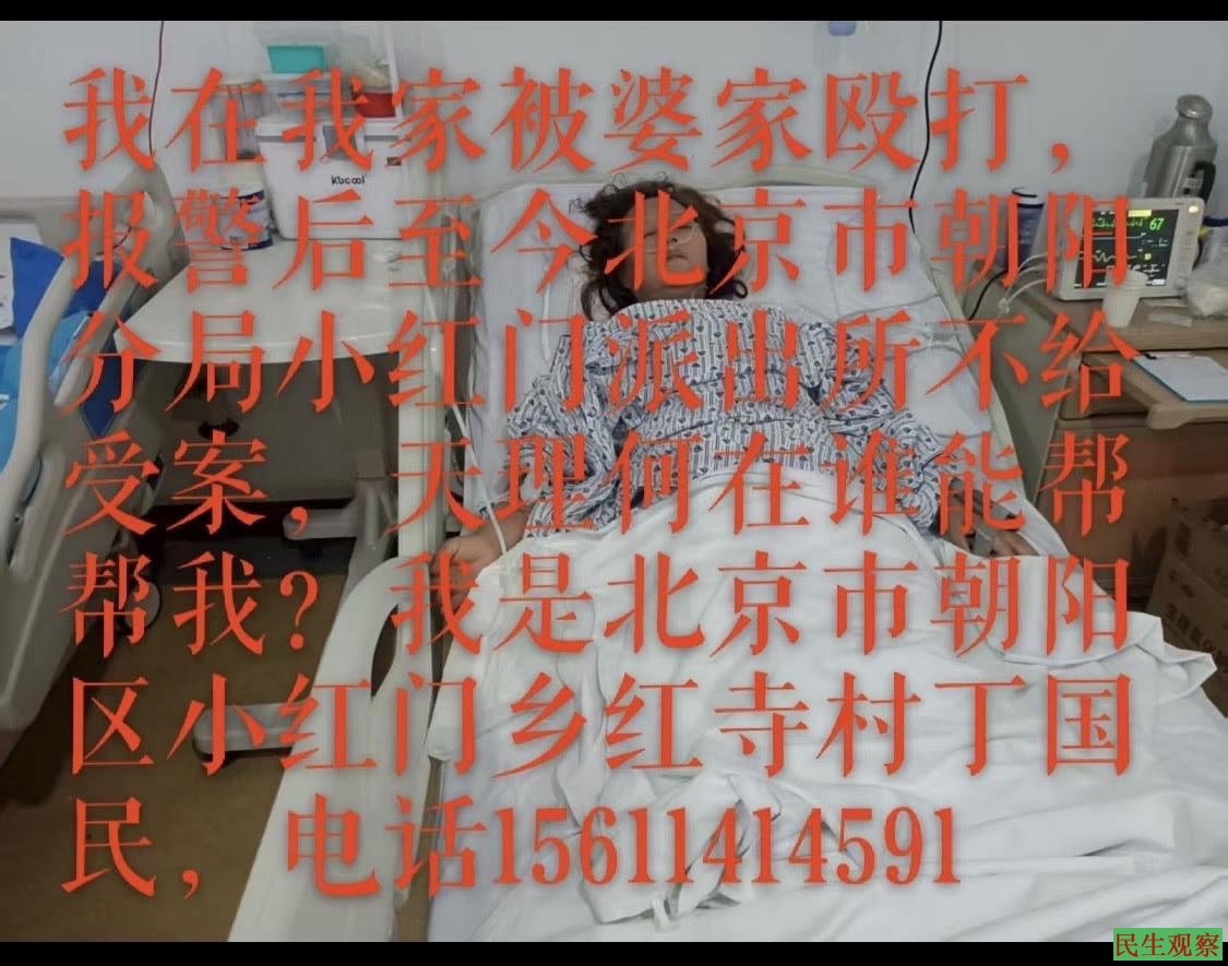 【民生观察2025年8月23日消息】北京市朝阳区村民丁国民在家被婆家人上门殴打,报警后至今北京市朝阳分局小红门派出所不给立案,也不出具不予立案通知书。丁国民依法进行投诉,其有智力障碍的丈夫却遭到警方的暴力传唤。近日,丁国民再次举报投诉北京市朝阳分局小红门派出所民警违法办案。