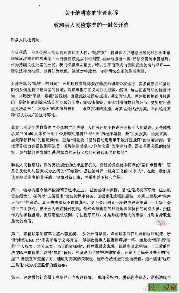 【民生观察2025年12月14日消息】湖南株洲自媒体人尹建根因发布批评和县历阳镇党委书记刘莹的文章,遭到和县警方的跨省抓捕刑拘,目前案件已移送和县检察院审查起诉。得知上述情况后,数十名网友发起联署签名并致信和县人民检察院,请求该院严格依法独立客观公正审查,依法作出不予起诉决定。