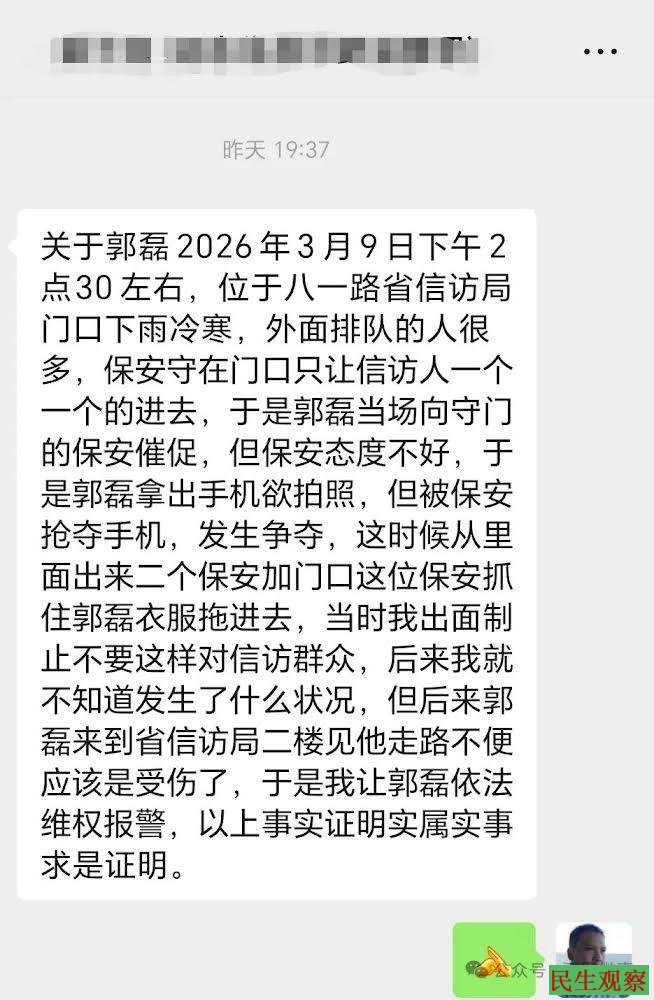 【民生观察2026年3月10日消息】近日,湖南老兵郭磊前往湖南省信访局登记,在大门外因拿手机拍照监督保安,被安保人员暴力围攻控制并受伤。报警后,郭磊到蓉园派出所做了相关笔录,之后郭磊前往医院进行检查,目前其在等待进一步检查结果当中。