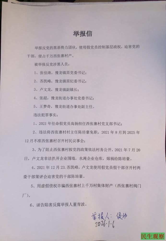 2026年1月6日,侯帅向荥阳市政法委员会举报黑恶势力,反党涉黑人员豫龙镇原党委书记张佳涛、豫龙镇原纪委书记苏凯峰、豫龙镇副镇长卢文龙、豫龙街道办事处党委书记张超、以及豫龙街道办事处副主任王梦奇等人,使用假党员控制基层政权,迫害党的干部,滥用职权侵占西张寨村上千万村集体财产等违法乱纪问题。