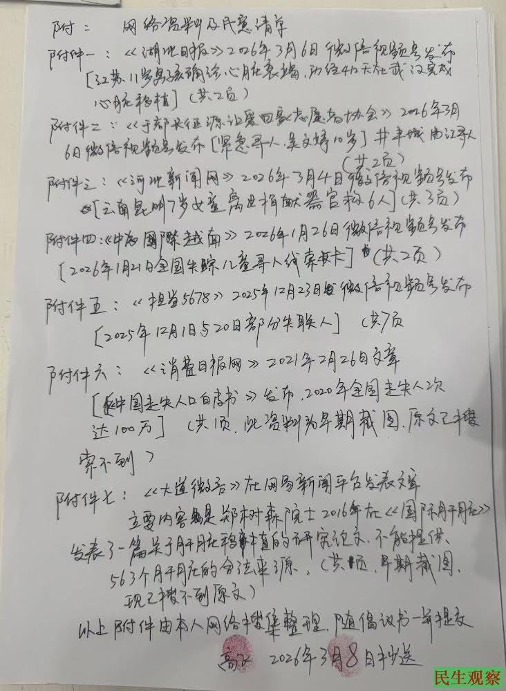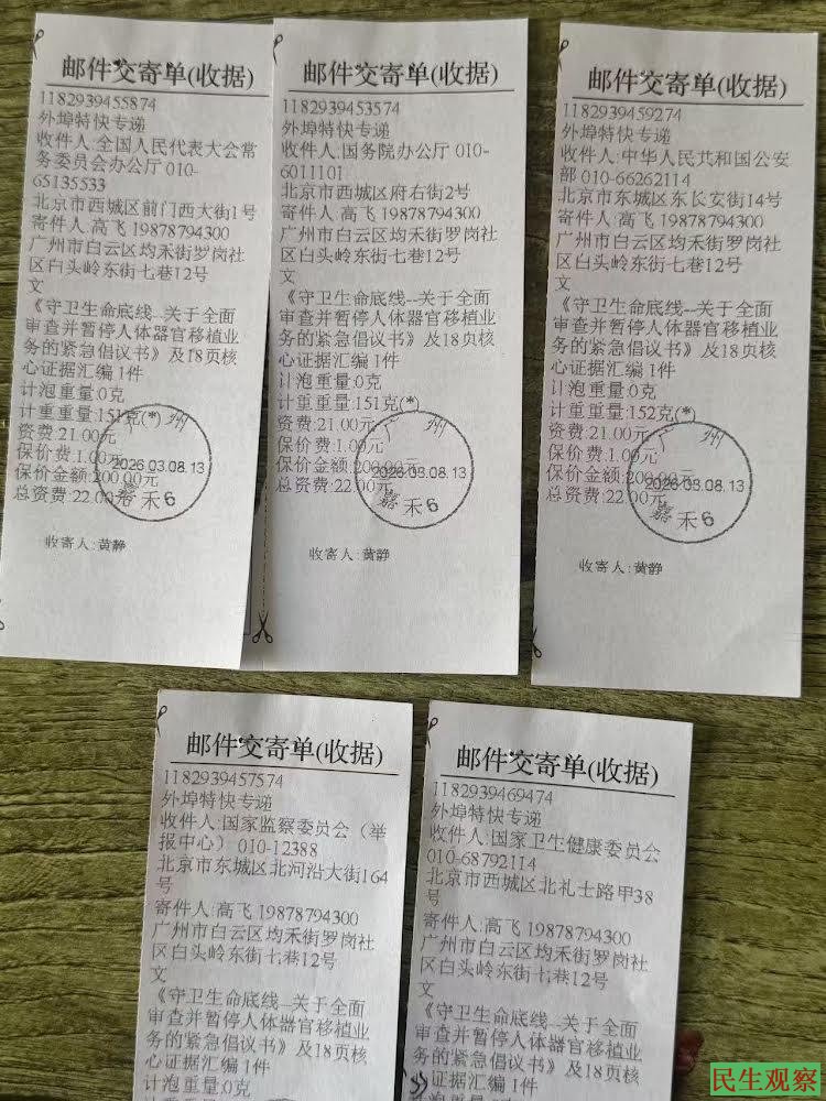 【民生观察2026年3月12日消息】近日,公民高飞已向有关国家机关正式邮寄《守卫生命底线:关于全面审查并暂停人体器官移植业务的紧急倡议书》,现相关邮件显示已签收。3月12日,高飞接到广州白云区公安局电话,告知公安部已接收到该倡议书。今日,高飞就自己为何提出此项倡议,向全体公民作出说明。