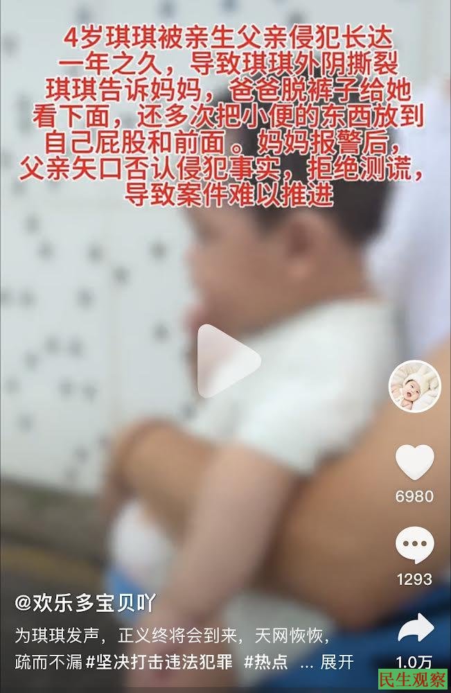 据悉,根据“宁海四岁琪琪妈妈”的抖音账号及微博账号的作品内容显示,博主的女儿琪琪从四岁开始多次被亲爸侵犯。