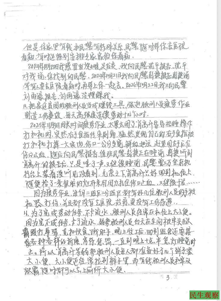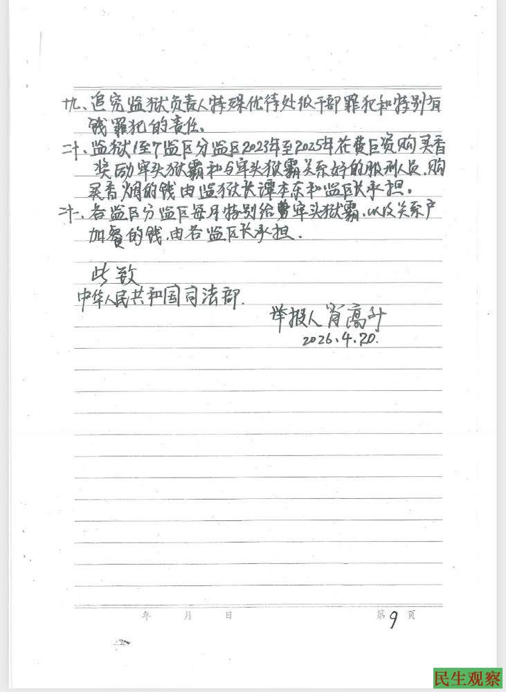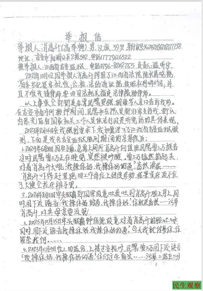 【民生观察2026年4月27日消息】江西吉安人权捍卫者肖高升(高举牌)于2021年被捕,后被以虚假诉讼、寻衅滋事罪判刑4年6个月,2026年3月18日刑满释放。近日,肖高升实名向司法部举报江西省吉安监狱纵容牢头狱霸殴打辱骂虐待服刑人员等违法问题,同时要求吉安市中级人民法院进行立案调查。