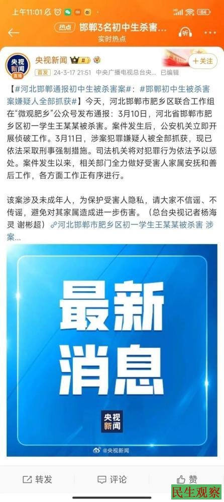 1、邯郸初中生被杀害案追踪:18日凌晨进行了尸检律师团队已现场取证