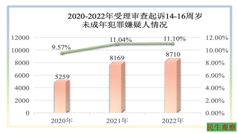 低龄未成年人犯罪占比上升。2020年至2022年,检察机关受理审查起诉14至16周岁的未成年犯罪嫌疑人数分别为5259人、8169人、8710人,分别占受理审查起诉未成年犯罪嫌疑人总数的9.57%、11.04%、11.1%。这也从一个侧面印证着中国学龄儿童校园犯罪严重情况。