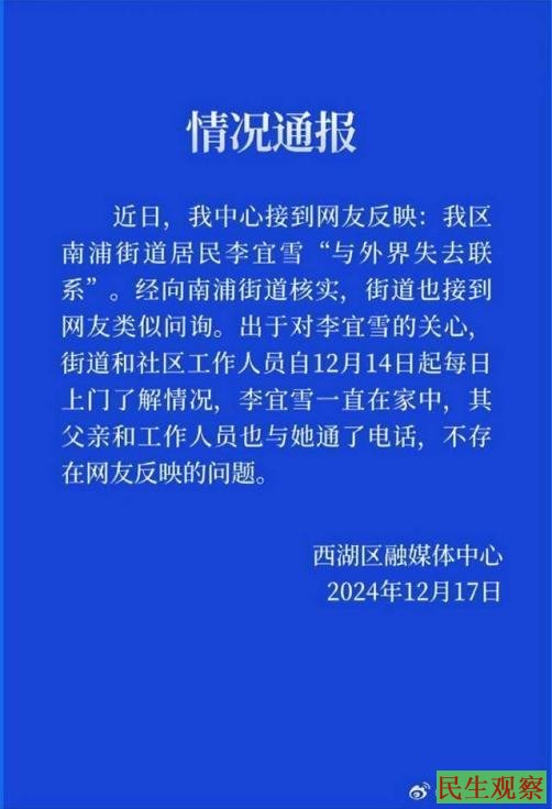 据南昌市西湖区融媒体中心官方微博通报,近日,该中心接到网友反映,西湖区南浦街道居民李宜雪“与外界失去联系”。经向南浦街道核实,街道也接到网友类似问询。出于对李宜雪的关心,街道和社区工作人员自12月14日起每日上门了解情况,李宜雪一直在家中,其父亲和工作人员也与她通了电话,不存在网友反映的问题。